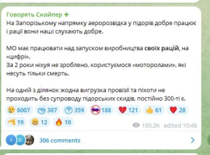 "На Запорожском направлении аэроразведка у п*доров хорошо работает и рации они наши слушают хорошо. МО должно работать над запуском производства своих раций, на "цифре". На одном из участков ни одна выгрузка провизии и пехоты не проходит без сопровождения п*дорских сбросов, постоянно 300-е есть", — написал он.