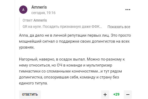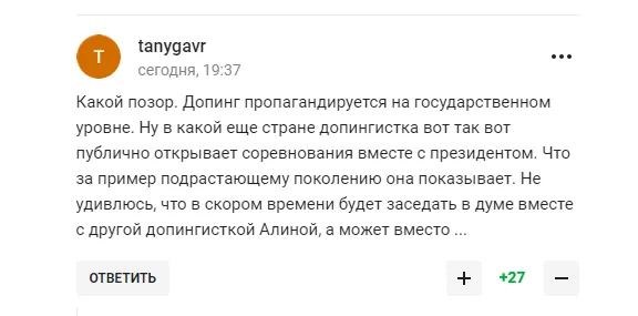 "Какой позор. Допинг пропагандируется на государственном уровне. Ну в какой еще стране допингистка вот так публично открывает соревнования вместе с президентом. Что за пример подрастающему поколению она показывает. Не удивлюсь, что скоро будет заседать в думе вместе с другой допингисткой Алиной. А может вместо этого ..." – пишут пользователи.