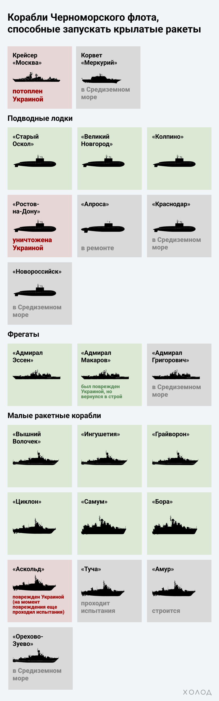 Тем не менее не стоит ожидать, что Россия вовсе перестанет наносить по территории Украины удары «Калибрами» морского базирования. Как отмечает Руслан Левиев в разговоре с «Холодом», российский флот может наносить ракетные удары с большого расстояния, в том числе и из Каспийского моря.