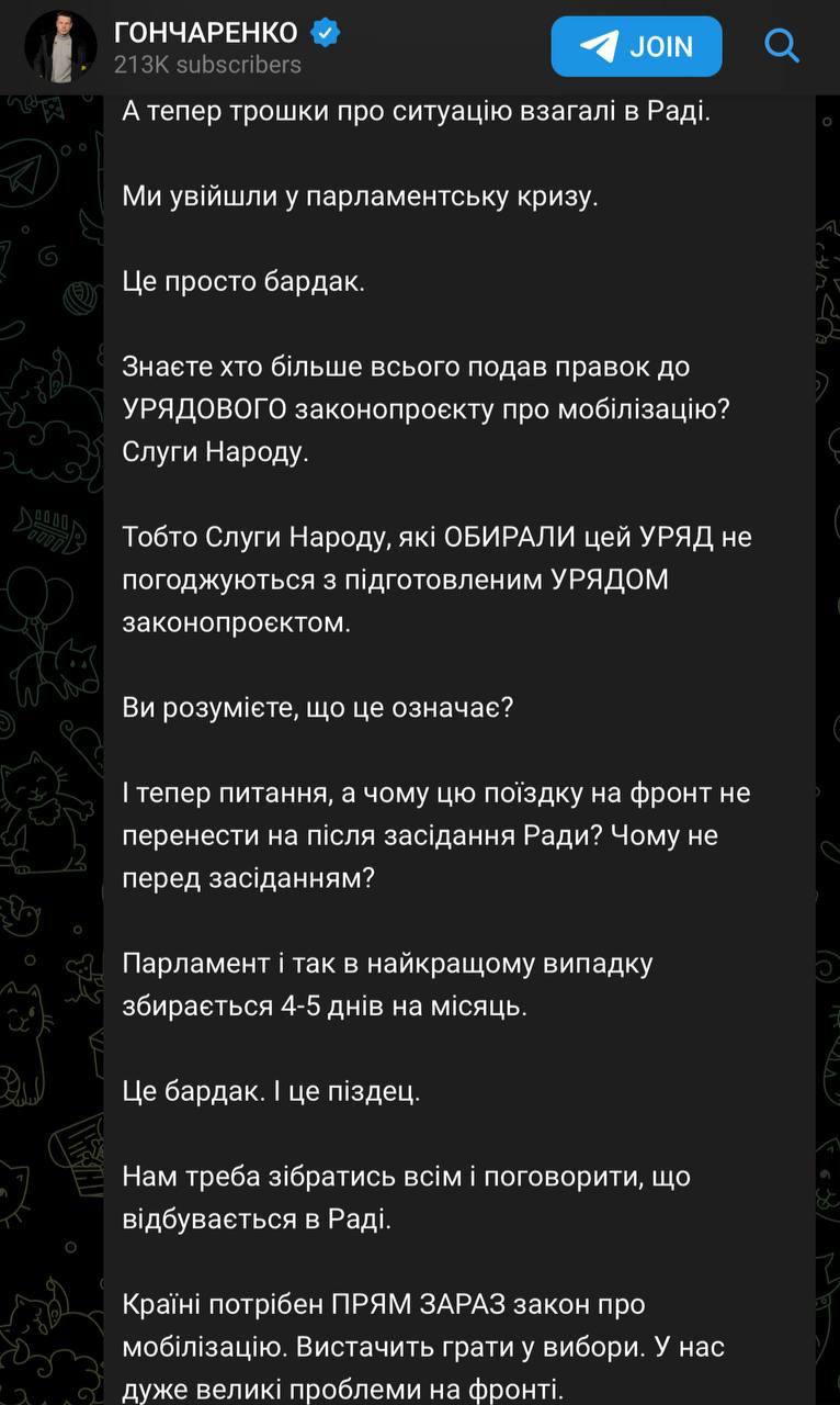 Нардеп Гончаренко от партии "ЕС" призывает немедленно принять законопроект о мобилизации