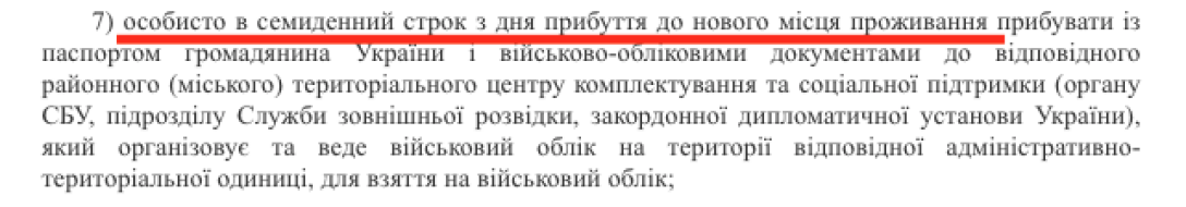Поэтому вполне приемлемой и законодательно правильной является формулировка требования, содержащейся в приказе начальника Никопольского районного ТЦК: смена места жительства (пребывания) военнообязанными без разрешения начальника запрещается. В случае изменения места нахождения, согласно действующему законодательству, нужно в 7-дневный срок лично явиться в ТЦК с соответствующими документами.