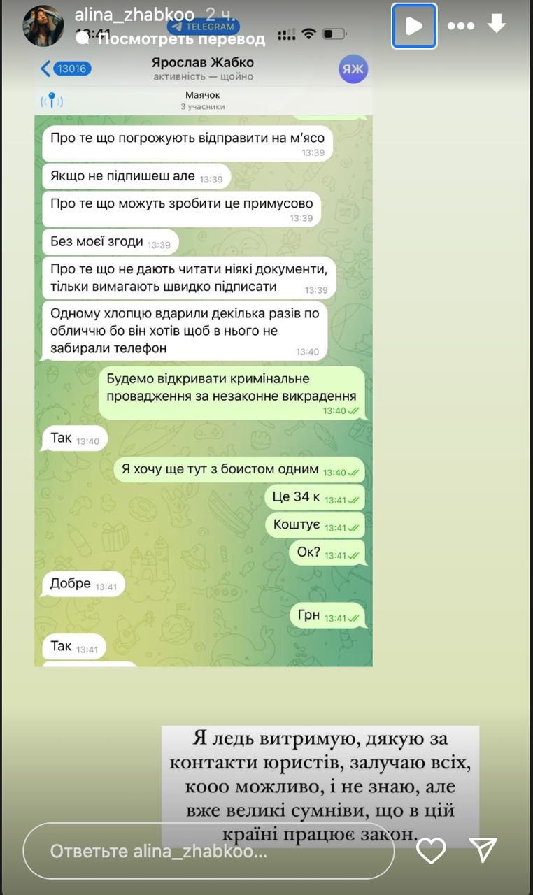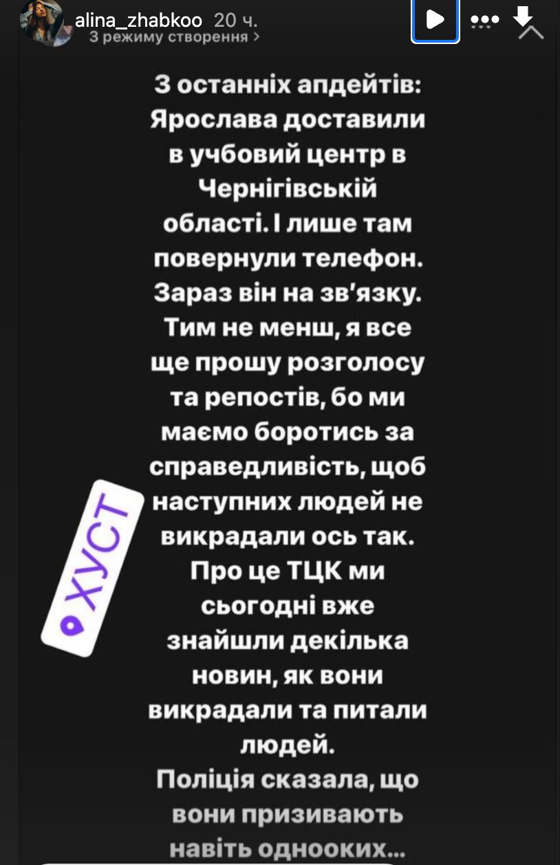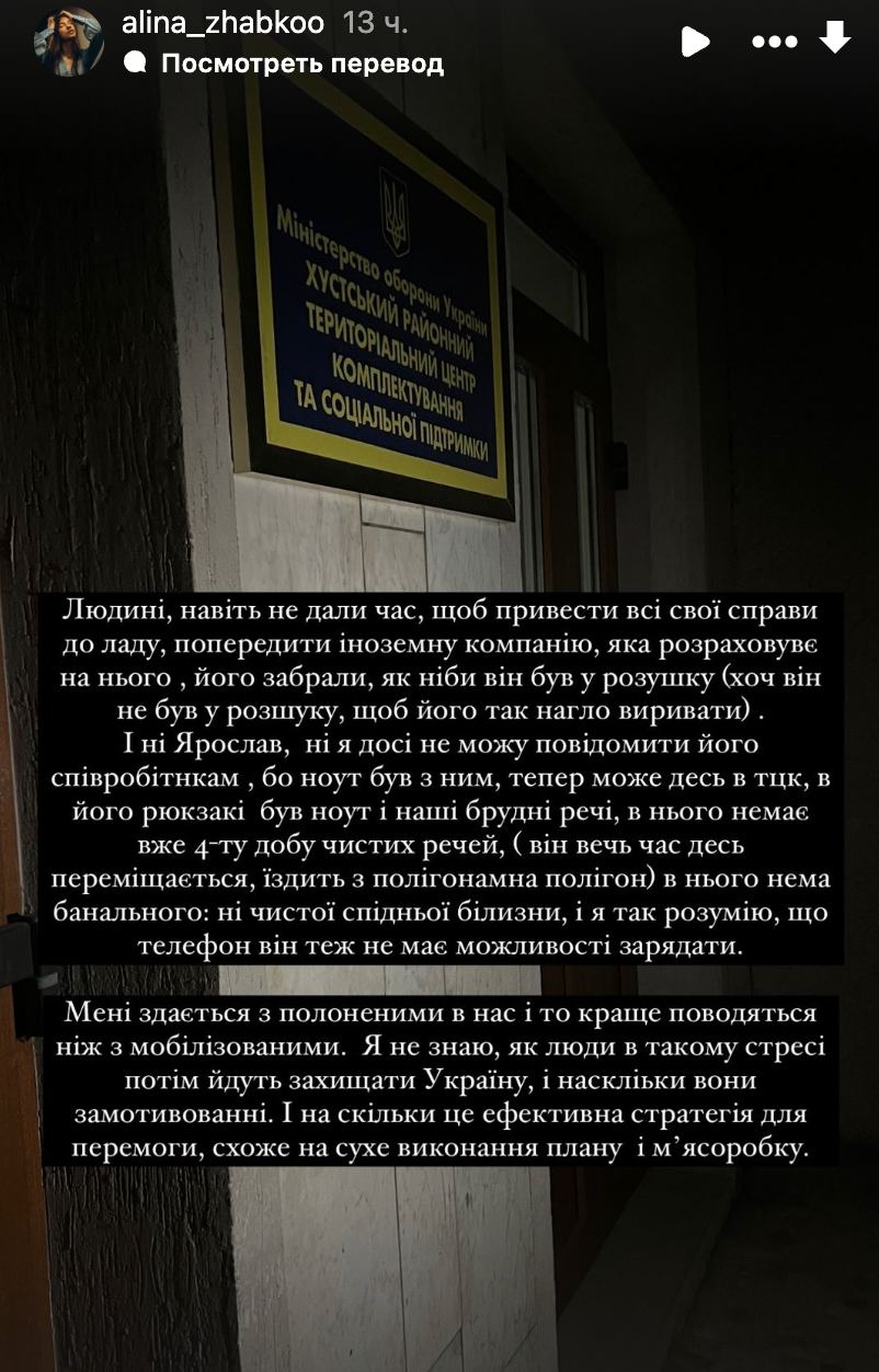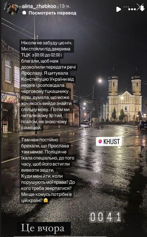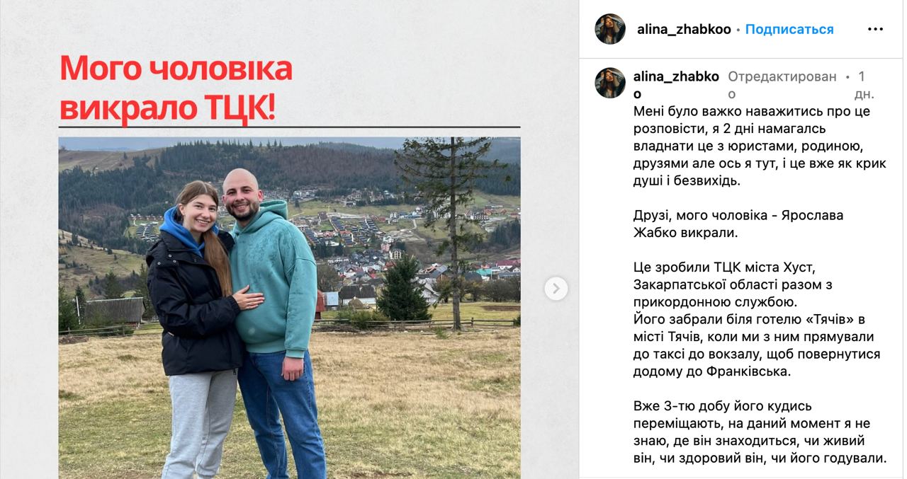 "Моего мужа - Ярослава Жабко похитили. Это сделали ТЦК города Хуст, Закарпатской области вместе с пограничной службой. Его забрали возле гостиницы "Тячев" в городе Тячев, когда мы с ним направлялись к такси до вокзала, чтобы вернуться домой во Франковск. Уже 3 сутки его куда-то перемещают, на данный момент я не знаю, где он находится, жив ли он, здоров ли он, кормили ли его. За эти 3 суток, я общалась с ним где-то 3 раза: от 30 сек до 2 мин", - сообщает девушка в сети.