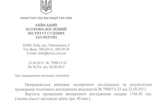 Подтверждает вывод КНИИСЭ и предоставленная суду справка из Укрпочты, из которой следует, что доказательств отправления в указанный период с почтового отделения № 151 г. Киева, уведомлений на адрес Солоневич не существует. А работники отделения почты ВПЗ-151, подписи, проставленные на документах, своими не признали. Заместитель директора по вопросам технологии Князева Н.П. обращает внимание заявителя на то, что в качестве подтверждающего отправление документа, должны быть предьявлены кассовые чеки, либо расчетные квитанции. Как уже было сказано выше, и этих документов не существует.