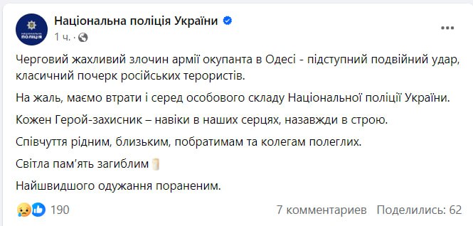 Среди погибших сегодня от удара по Одессе есть полицейские.