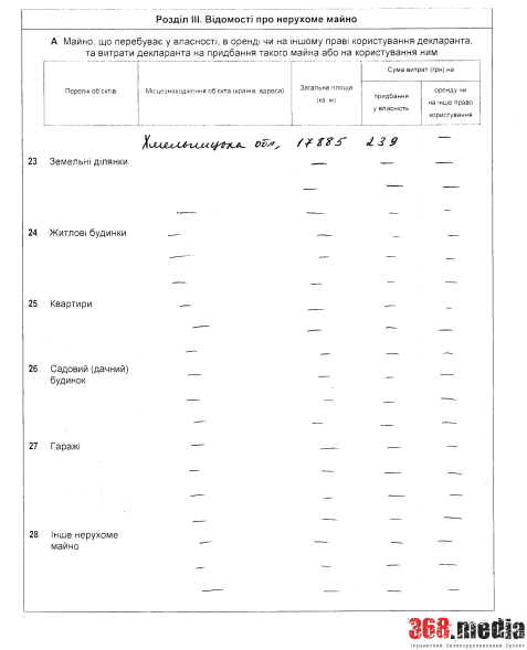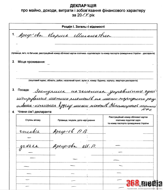 В декларации у Арефьевой и ее семьи нет ни автомобилей, ни другой недвижимости, кроме крупного земельного участка в 1,7 гектара в Хмельницкой области, который она купила за… 239 гривен. Кроме того, у ее супруга есть гараж в Донецке.