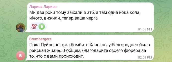 ""Если в РФ нет мяса, помидоров, огурцов, тогда съедайте того, которого выбрали"; "Пока Пуйло не стал бомбить Харьков, белгородцы имели райскую жизнь. В общем, благодарите своего фюрера за то, что с вами происходит"; "Можем дроном доставить продукты, но есть нюанс"; "Мы это прошли 2 года назад"; "Все ваше мясо на фронте"; "Мы два года назад заехали в АТБ, а там одна кока-кола, ничего, выжили, теперь ваша очередь», – пишут украинцы.