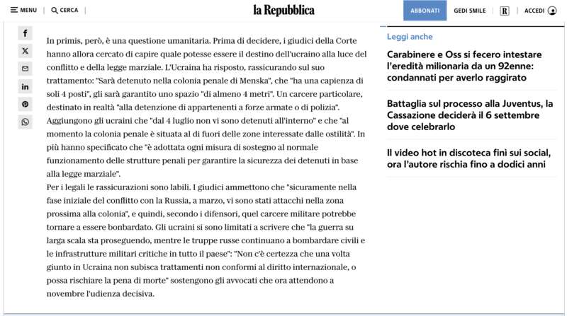 В ее тексте приводятся позиции украинских силовиков и итальянских адвокатов "Недели". Последние, со ссылкой на широкомасштабное военное вторжение армии РФ высказывали опасения, что их уважаемого клиента, в случае отправки на Родину, могут либо убить, либо уложить в "красную" Минскую колонию, где его личное пространство будет ограничиваться 4 м2.