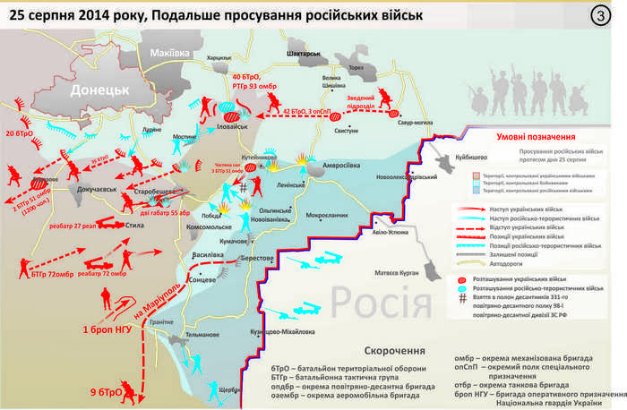 "После проведения артиллерийской поддержки атаки с огневых позиций, расположенных на территории Российской Федерации, подразделения российских вооруженных сил овладели следующими рубежами: на севере: Старобешево - Агрономическое - Кутейниково - Амвросиевка; на юге: Солнцево - Гранитное - Тельманово – Новоазовск", - говорится в отчете.