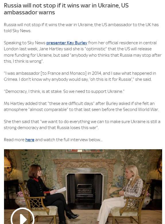 Посол США в Великобритании Джейн Хартли заявила, что Россия не остановится, если выиграет войну в Украине.
