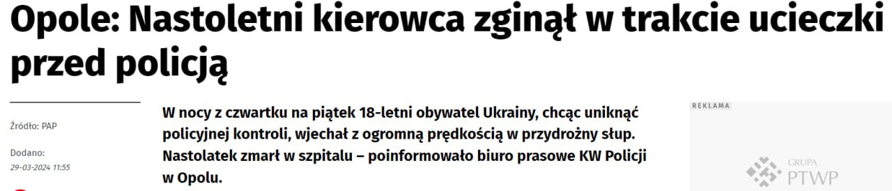 Издание WNP пишет, что в Польше во время бегства от полиции погиб 18-летний украинец.