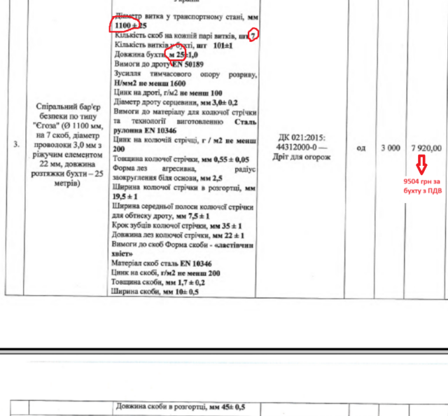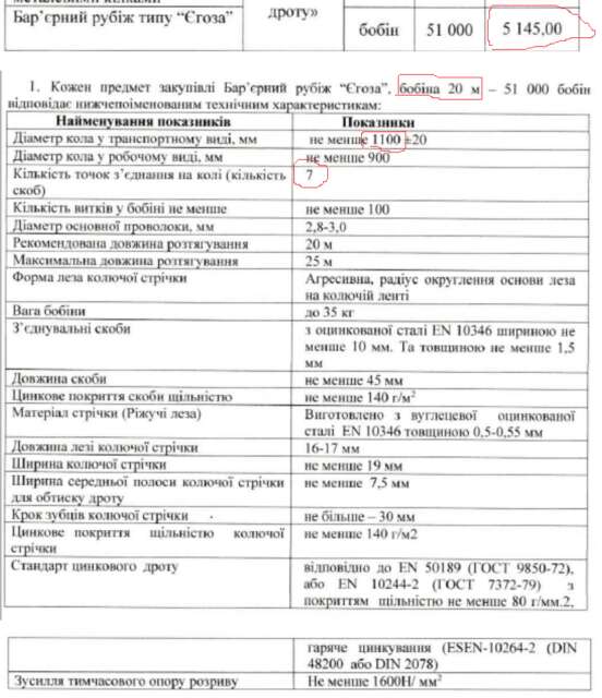 К примеру, одна из воинских частей Черниговщины заказала «Егозы» и путанки на 677 млн грн. Здесь барьерный рубеж Ø1100 мм на 7 скоб с оцинковкой скобы и ленты плотностью от 140 граммов на м2 заказали по 5145 грн за 20-метровую бухту с учетом НДС. То есть цена одного метра на уровне 250 грн: