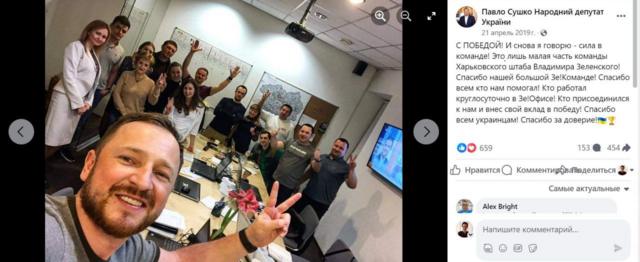 Так, во время второго тура президентских выборов 21 апреля 2019 года в то время руководитель харьковской “Слуги народа”, а сегодня уже нардеп Павел Сушко опубликовал пост со словами благодарности: “Это лишь малая часть команды Харьковского штаба Владимира Зеленского! Спасибо нашей большой Зе! Команде!”. Под этим постом он запостил групповое фото команды – на нем на заднем фоне есть мужчина с двумя поднятыми руками. Это и есть Вадим Слюсарев.