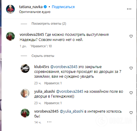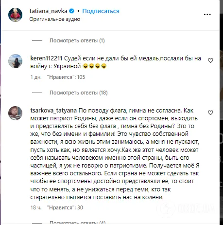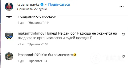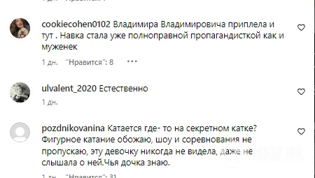 "Владимира Владимировича приплела и здесь. Навка стала уже полноправной пропагандисткой, как и муж", "Хахаа, под нейтральным флагом. Оккупационный флаг ра#ки нигде не признают", "Молодец, хорошо лизнула", - смеются фанаты.