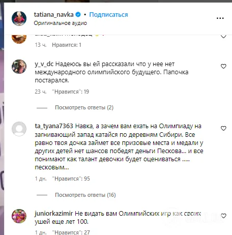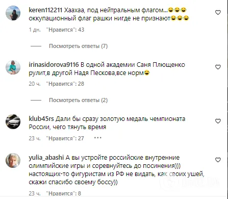 "Судей, если бы не дали ей медаль, послали бы на войну с Украиной", "Дали бы сразу золотую медаль чемпионата России, чего тянуть время", "В одной академии Саня Плющенко рулит, в другой Надя Пескова, все норм", - пишут россияне .