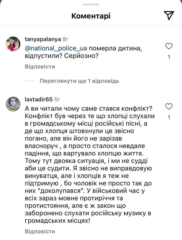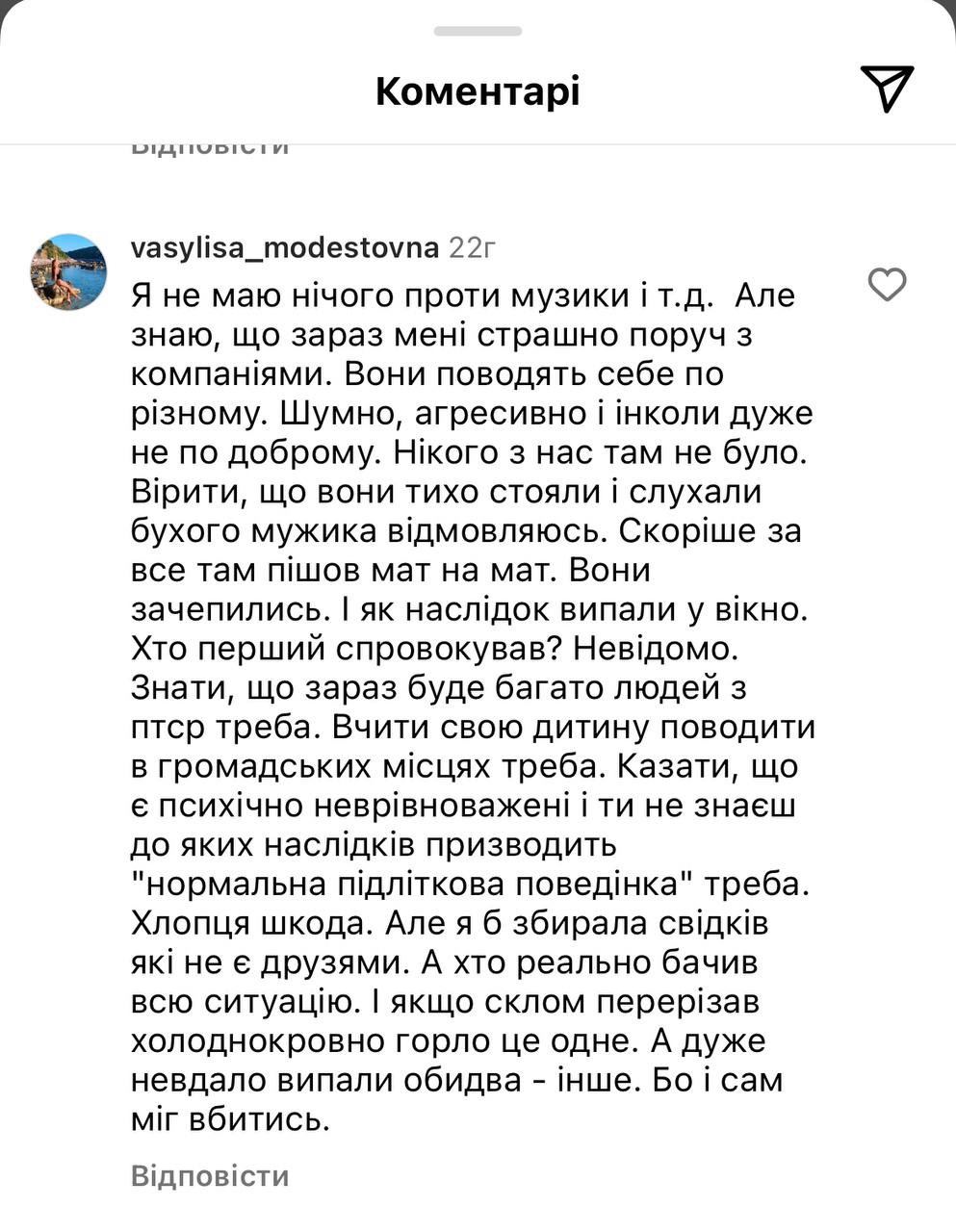 По ее словам, под постами, посвященным смерти парня, появились негативные комментарии о том, что на самом деле работника УГО спровоцировала российская музыка, которую слушали подростки. Однако девушка утверждает, что в тот момент никто из них не слушал музыку.