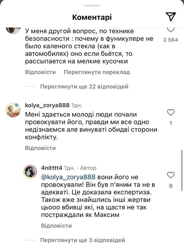 «После того, как фуникулер доехал, Максим и его друзья вышли через нижние двери, Максим был последним. Вопрос: почему мужчина (Косов, — Ред.) не вышел через двери, которые находились рядом с ним? Почему он следовал за Максимом? Это говорит о том, что Косов хотел спровоцировать и убить Максима», — говорит девушка.