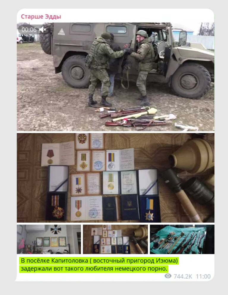 Этот самый журналист в арафатке неоднократно попадал в сюжеты публикаций канала Старше Эдды, а также военных корреспондентов РФ, в частности на канале ANNA News (выпуск от 17 марта 2022 года с сюжетом об Изюме).