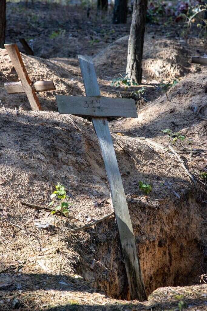 Крест с могилы Владимира Вакуленко на месте массового захоронения под городом Изюм Харьковской области. Источник: фото Говарда Баффета (Howard G. Buffett), 18 сентября 2023 г.