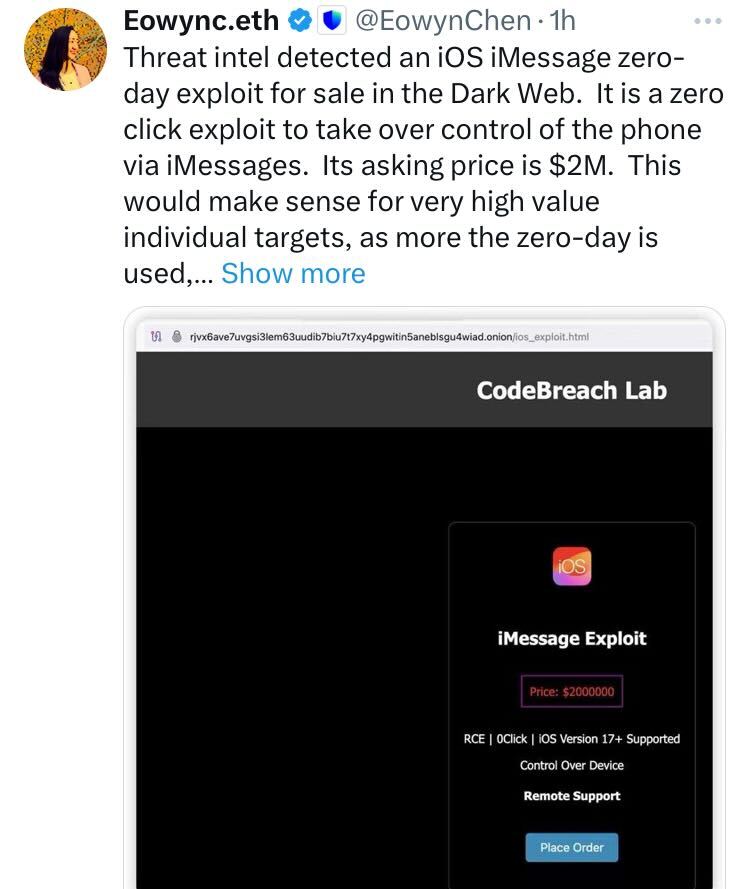 «Предупреждение для пользователей iOS: у нас есть достоверная информация о высокорисковом эксплойте нулевого дня, нацеленном на iMessage в Dark Web», — опубликовала компания X в 19:53 UTC 16 апреля.
