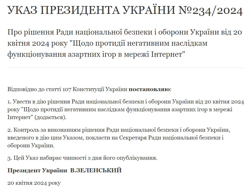 Президент Владимир Зеленский ввел в действие решение СНБО по ограничению азартных игр в Интернете.