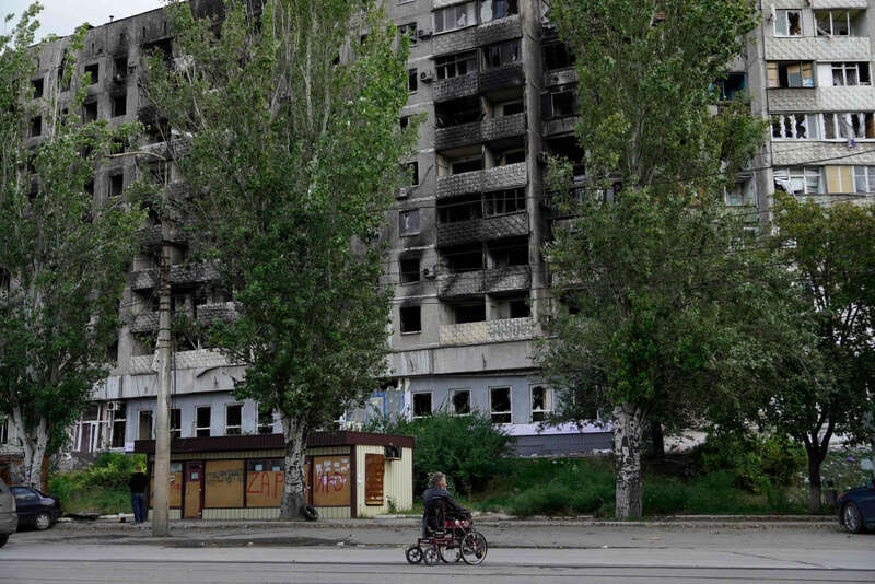 Мужчина в колесном кресле смотрит на разрушенное российской армией здание в Мариуполе. Фото: AFP/East News