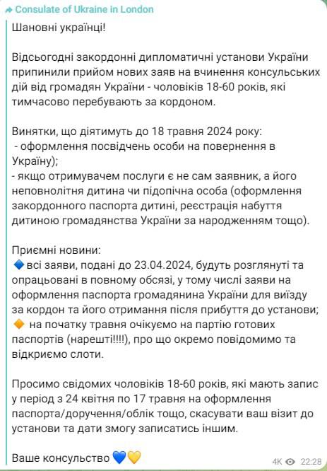 Украинское консульство в Лондоне подтвердило, что все заграничные дипучреждения прекратили прием новых заявлений на совершение консульских действий от военнообязанных мужчин.