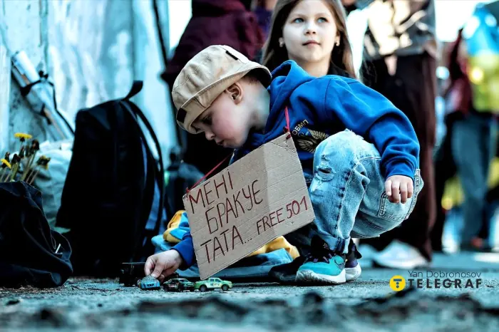 Как отметил корреспондент "Телеграф", дети держали плакаты с надписями: "Верните мне папу", "Мне не хватает папы", "У кого праздник, а я жду папу".