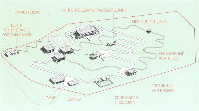 В главном здании разместится гардеробная, банкетный зал, кухня для холодных и кухня для горячих блюд, столовая, гостиная, ванная (адаптированная для маломобильных лиц), кинотеатр, охрана и рабочий кабинет.