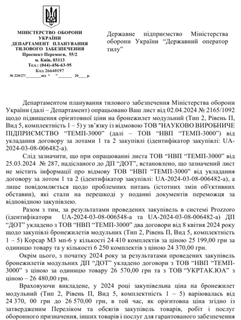 При этом монополия отечественного производителя привела еще к одному очень плохому следствию. Когда нашим военным понадобились быстрые и значительные обновления запасов, монополист не мог банально нарастить свои мощности. И такое было уже по меньшей мере дважды только за последние два года: в прошлом году , когда нужно было быстро надеть «гвардию наступления» и усилить броню, и сейчас, когда нужно одевать новую волну мобилизации. Вот пример из «Прозорро» , как «Темп-3000» в марте собственноручно отказался от подрядов по двум лотам на 600 миллионов гривен, а никто другой на торги даже в теории прийти не мог из-за низкой цены.