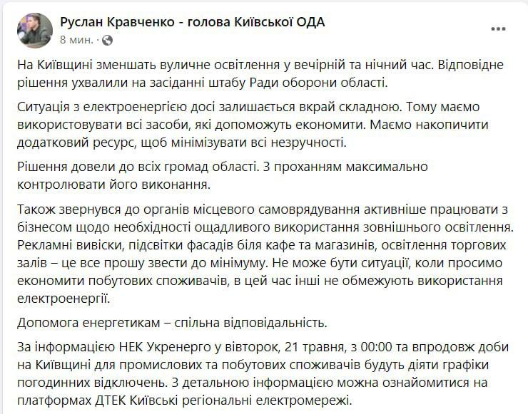 На Киевщине уменьшат уличное освещение в вечернее и ночное время. Соответствующее решение приняли на заседании штаба Совета обороны области, сообщил председатель Киевской ОВА Руслан Кравченко.