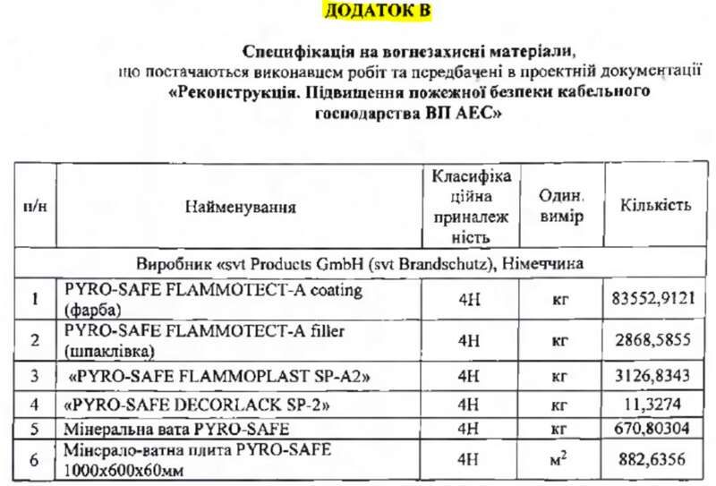 Кроме того, необходимо было подать технические условия или техническую спецификацию на огнезащитные материалы Pyro-Safe с согласованием в «Энергоатоме» и Госатомрегулировании. В случае отсутствия согласованных техусловий или технической спецификации на момент представления тендерного предложения, можно подать их проект, токсиколого-гигиенический паспорт, протоколы испытаний и протокол определения коэффициента снижения токовых нагрузок кабелей с вознезащитой. "Атомэнергоресурс" предоставил согласованную техническую спецификацию на Pyro-Safe.