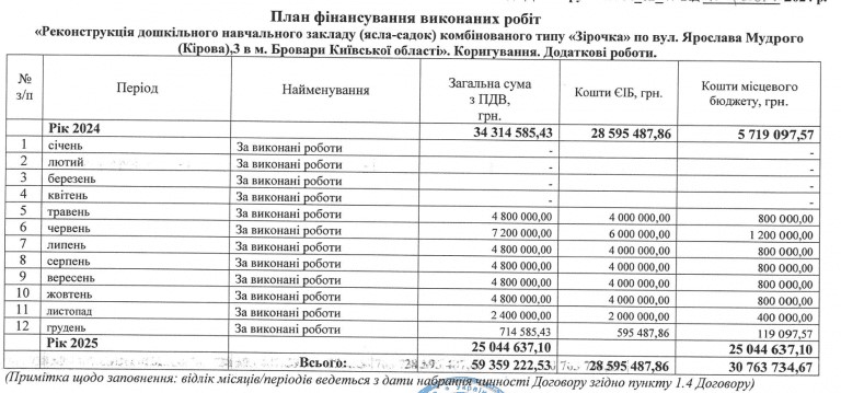 Сроком выполнения работ договором было определено конец текущего года, однако в день подписания договора стороны подписали дополнительное соглашение, которым срок действия договора продлили до конца 2025 года "в связи с отсутствием полного финансирования из местного бюджета". В дополнительном соглашении прописано, что из общей цены договора в 2024 году реконструкцию на 28,59 млн гривен профинансируют за средства Европейского инвестиционного банка, на 5,71 млн гривен – из местного бюджета, а в 2025 году – остальные 25,04 млн гривен должны составлять только местные средства.