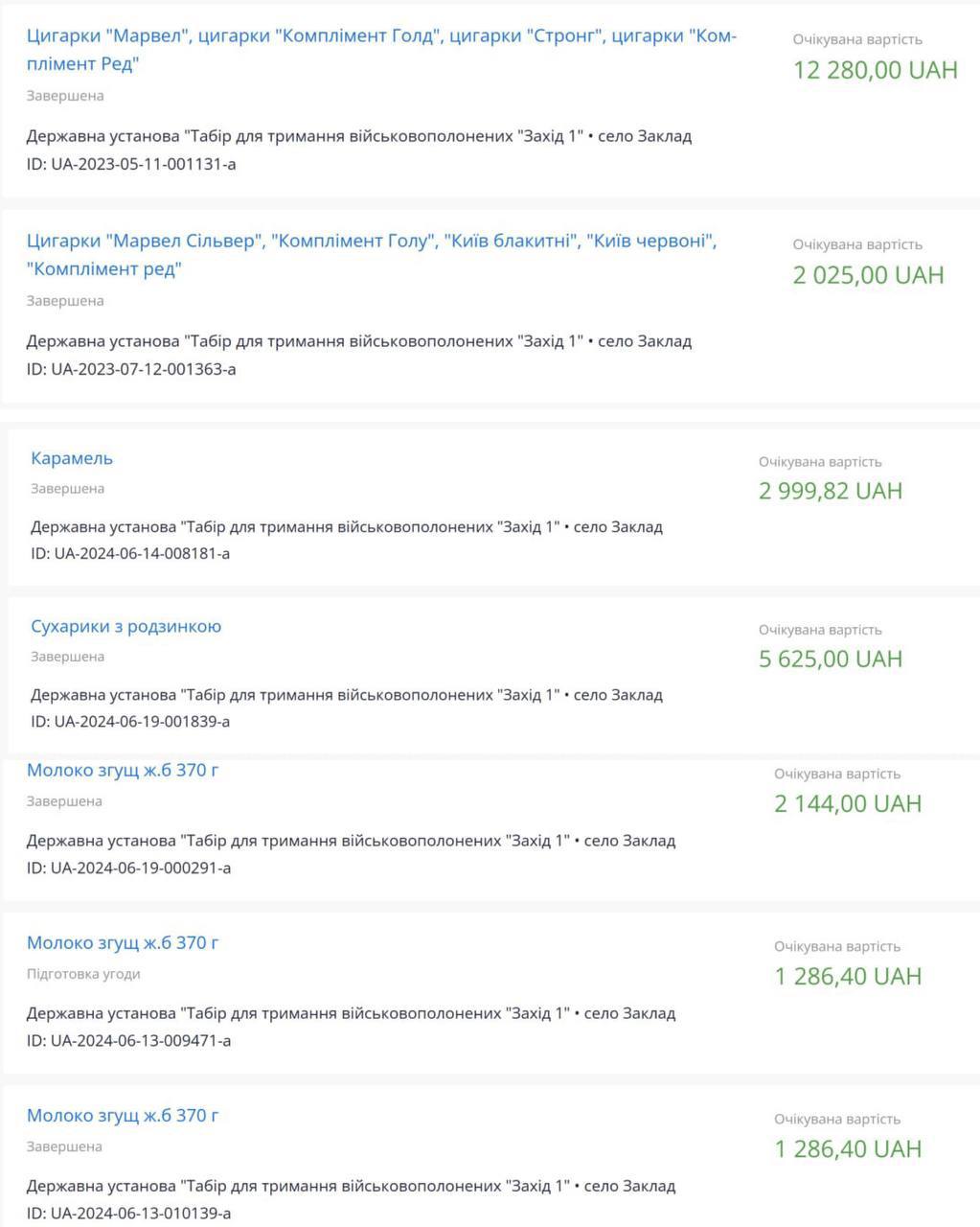 В частности, один из недавних тендеров, в котором участвовало одно из украинских госучреждений «Лагерь для содержания военнопленных», имеет статус завершенного — это объявление о намерении купить 20,4 кг карамели на сумму 2 999 грн. 82 коп.