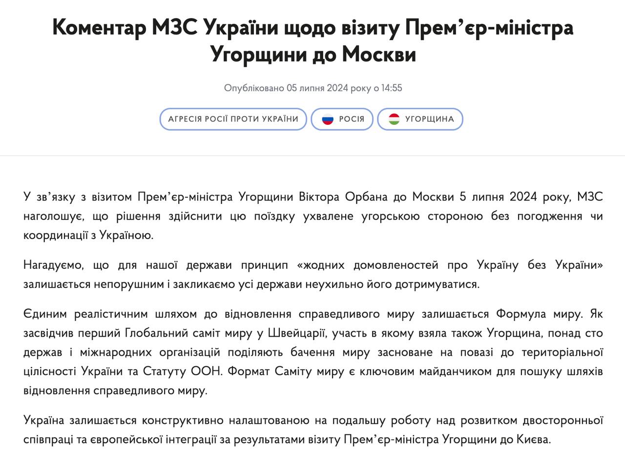 "Решение осуществить эту поездку принято венгерской стороной без согласования или координации с Украиной. Напоминаем, что для нашего государства принцип "никаких договоренностей об Украине без Украины" остается незыблемым, и призываем все государства неуклонно его придерживаться", - говорится в заявлении МИДа.