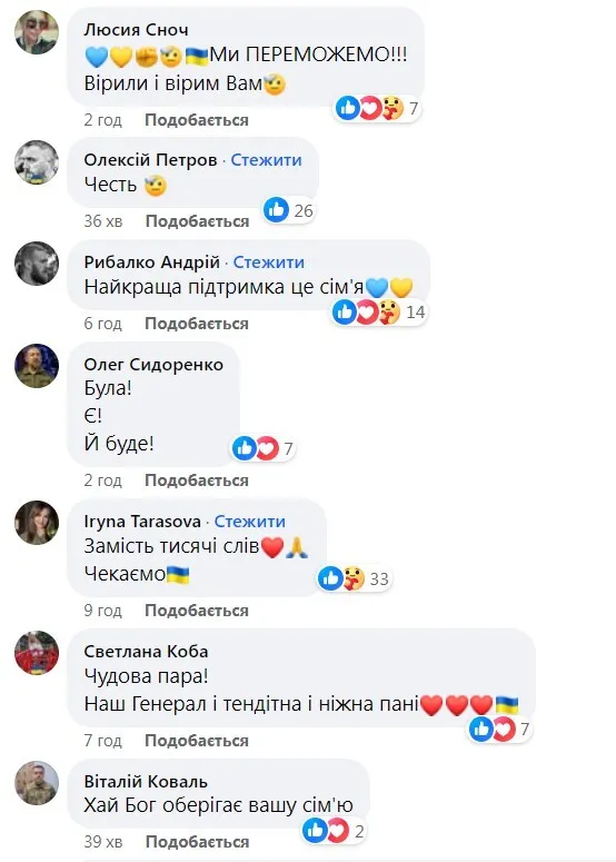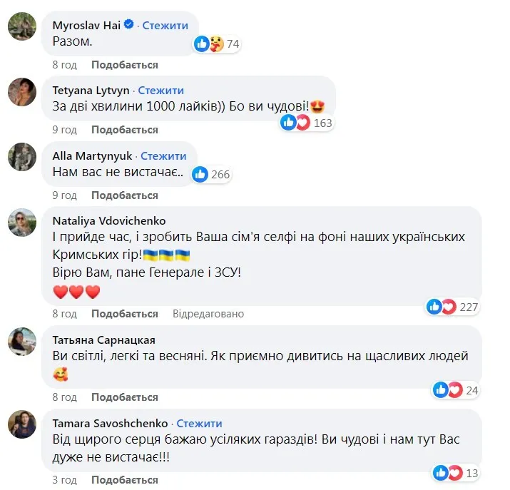 Украинцы оставили под фото сотню комментариев, поддерживающих слова украинского генерала об Украине, а также пожелали личного счастья его семье.