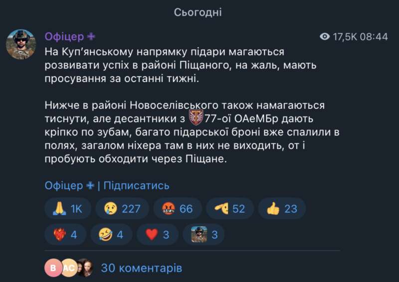 "На Купянском направлении пид*ры пытаются развивать успех в районе Песчаного, к сожалению, имеют продвижение за последние недели", – сказал офицер ВСУ "Алекс".