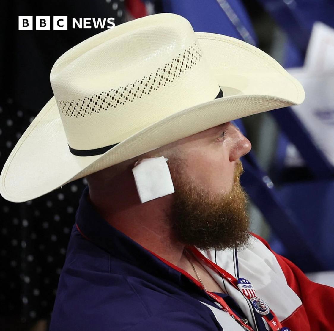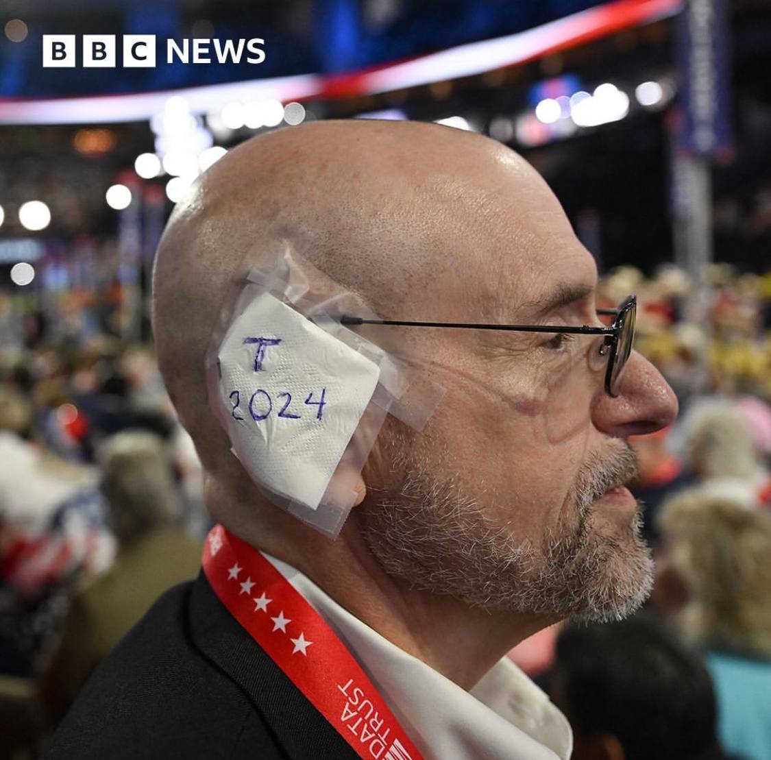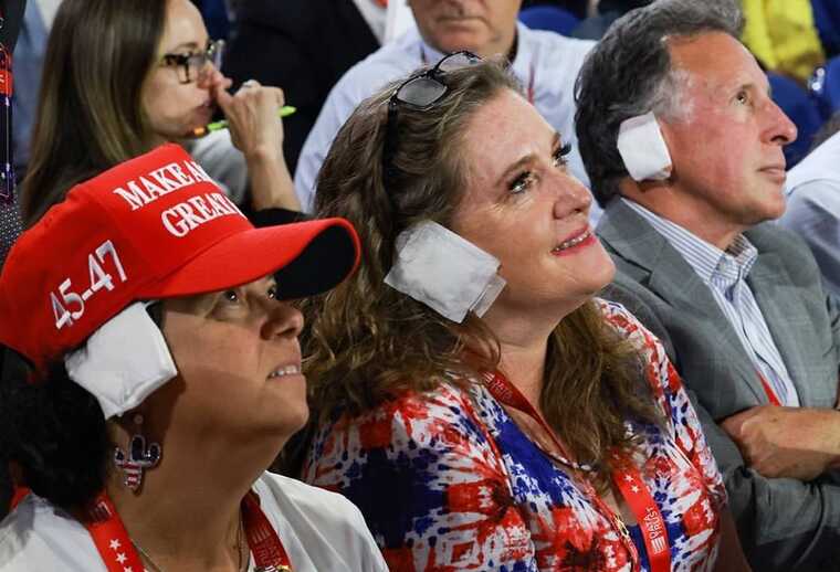 Несколько участников национального съезда Республиканской партии в Висконсине надели повязки на правое ухо в знак солидарности с кандидатом в президенты от партии Дональдом Трампом.