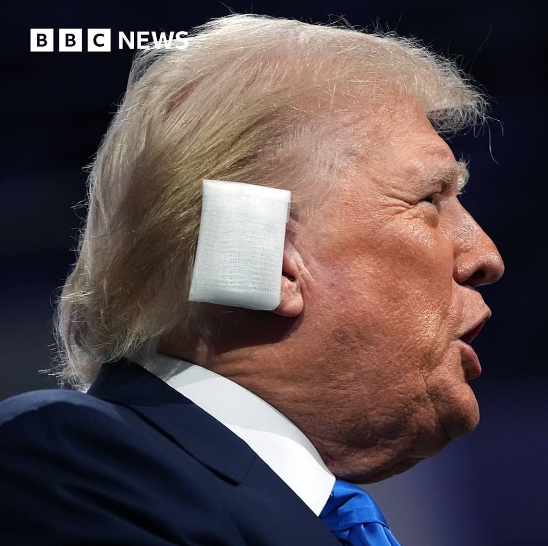 Бывший президент прибыл на съезд в Милуоки в понедельник вечером с повязкой на ухе, которая закрывала рану, нанесенную ему пулей стрелка на предвыборном митинге в Пенсильвании за два дня до этого.