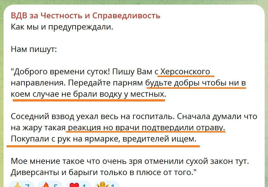 "Пишу вам с Херсонского направления. Передайте ребятам, пожалуйста, чтобы ни в коем случае не брали водку у местных. Соседний взвод поехал в госпиталь. Сначала думали, что на жару такая реакция, но врачи подтвердили яд. Покупали с рук на ярмарке, ищем вредителей. Мое мнение таково, что очень зря отменили сухой закон здесь. Диверсанты и барыги только в плюсе от этого», – сетует неназванный оккупант.
