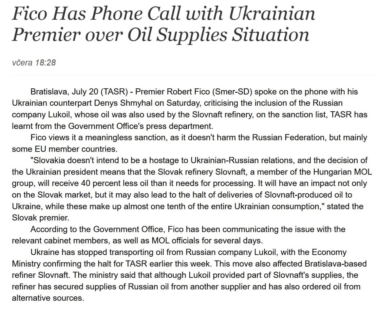В ходе беседы со Шмыгалем Фицо подверг критике включение в санкционный список российской компании "Лукойл", чью нефть также использовал нефтеперерабатывающий завод Slovnaft.