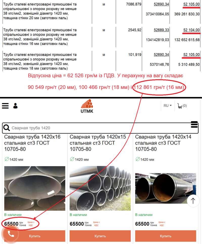 Сейчас в интернет-магазинах трубы 1420 мм разной толщиной стенки стоят от 40 тыс. грн/т до 60 тыс. грн/т , что по крайней мере на треть дешевле. Сайт «ЮТМК» предлагает трубу 1420х16 мм по 66 тыс грн/т , что на 42% дешевле ее сметной цены в 113 тыс грн/т.