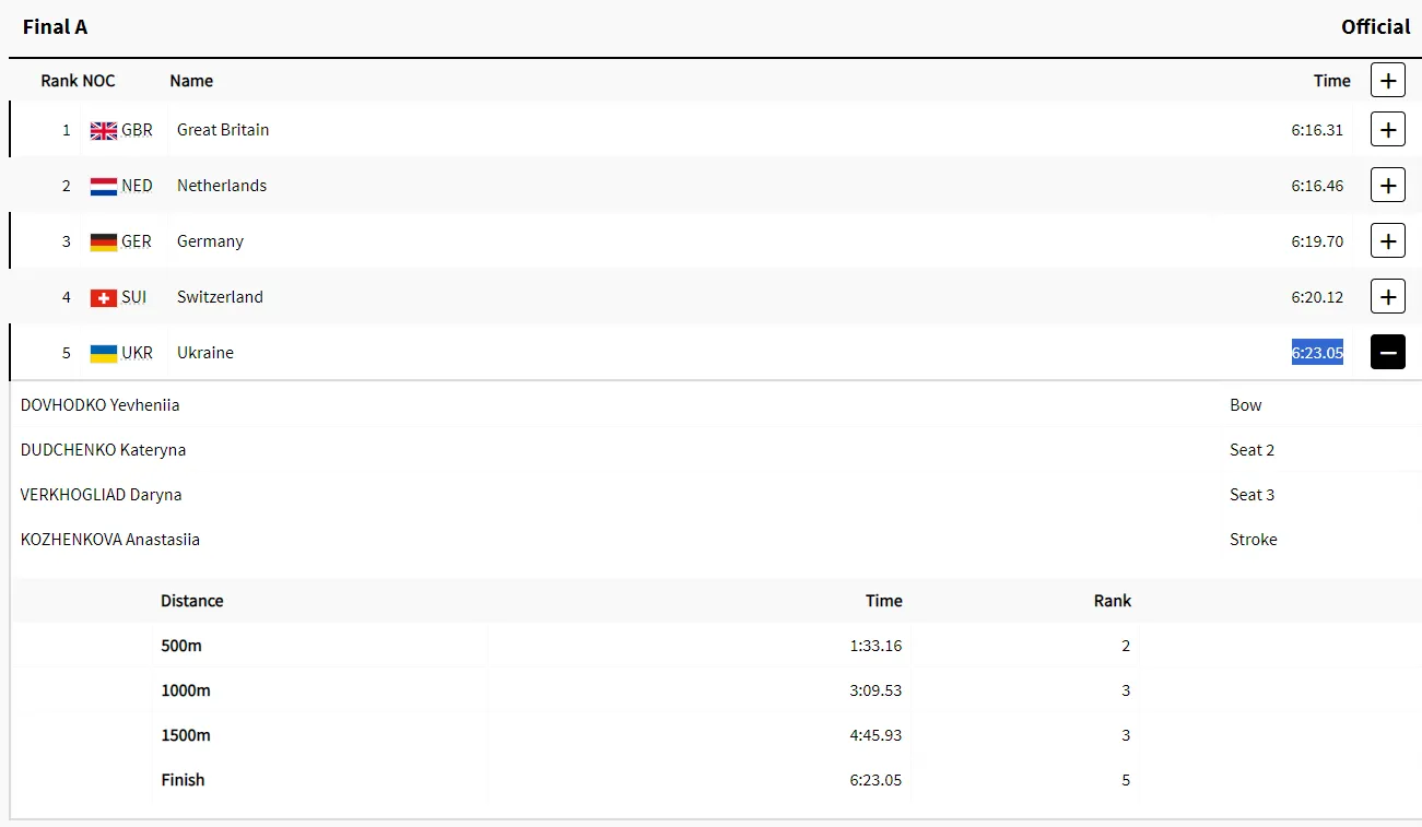 Женская сборная Украины по академической гребле стала пятой на Олимпийских играх 2024 года, которые в эти дни проходят в Париже. "Сине-желтые", цвет которых в соревнованиях парных четверок защищали Евгения Довгодько, Екатерина Дудченко, Дарья Верхосмотр и Анастасия Коженкова, преодолели 2000 метров дистанции за 6:23.05.