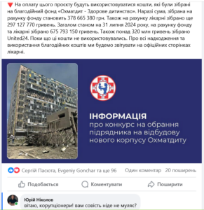 В «Охматдете» акцентировал внимание, что «проведенный конкурсный отбор не является тендером в понимании Закона Украины «О публичных закупках», а является частным конкурсом, организованным в целях открытого и добросовестного использования средств, пожертвованных гражданами».