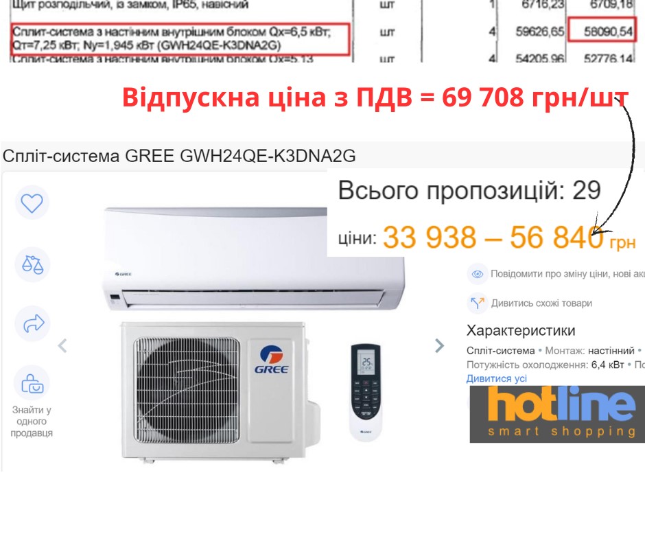 Простая проверка на hotline показывает среднюю рыночную цену этих сплит-систем на уровне 47 тыс. грн. А в одном из магазинов, с которым удалось связаться журналистке, подтвердили, что у них есть идентичные за 34 тыс. грн. Это почти вдвое дешевле, чем в смете.