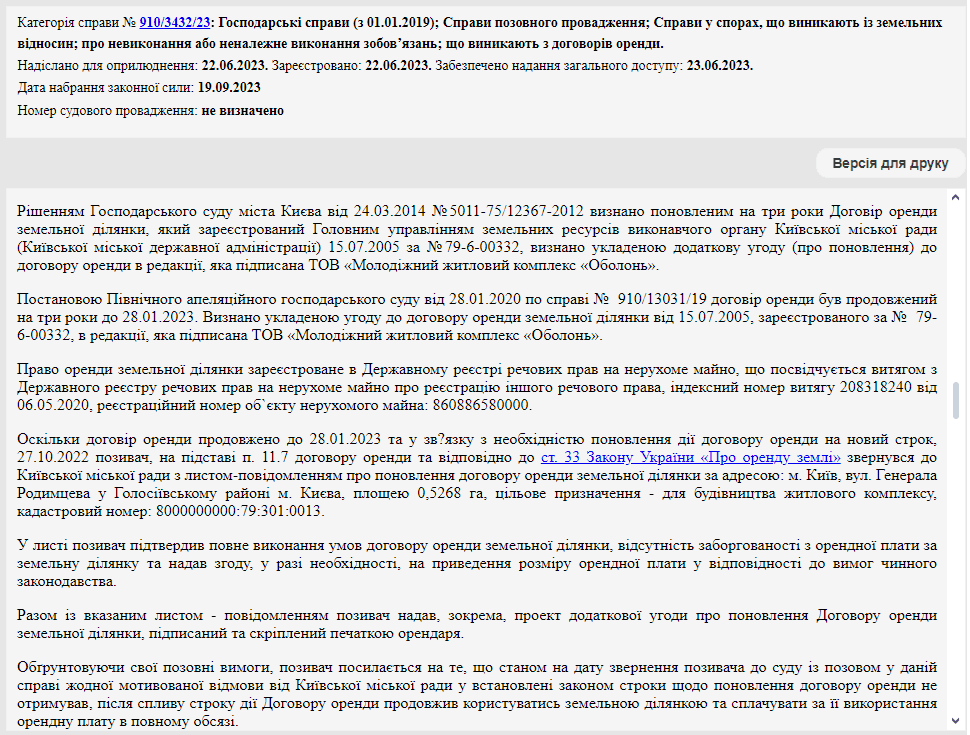 Учитывая такую довольно "вялую" позицию Киевсовета и Департамента земельных ресурсов Киевской горгосадминистрации (КГГА), который по этому делу выступал в качестве третьего лица на стороне ответчика, 1 июня 2023 года Хозяйственный суд Киева полностью удовлетворил иск ООО "МЖК "Оболонь", восстановив арендное соглашение на 3 года.