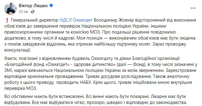 Гендиректор «Охматдета» Жовнир был отстранен от выполнения обязанностей до завершения проверок по восстановлению зданий больницы после российской атаки 8 июля.