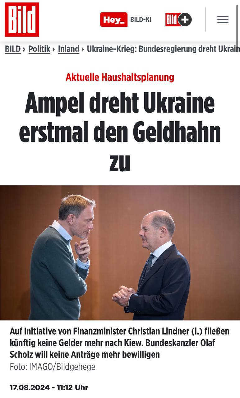 В Bild сообщают, что Олаф Шольц распорядился заморозить любую дополнительную помощь Украине из-за нехватки средств в бюджете.