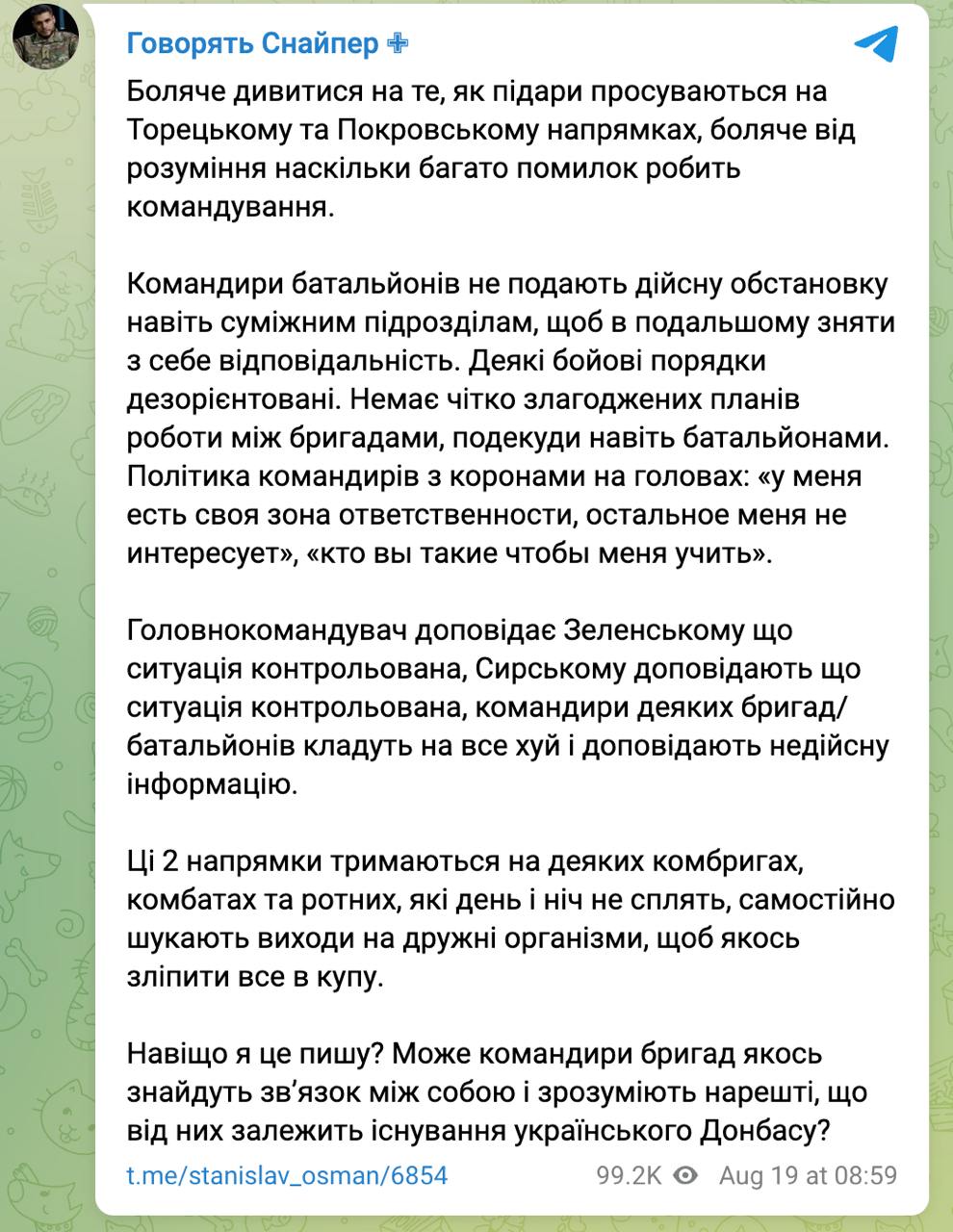 По его информации, "командиры некоторых бригад/батальонов кладут на все х@й и докладывают недействительную информацию", дальше по цепочке Сырскому докладывают, что ситуация контролируемая, а он это докладывает Зеленскому.
