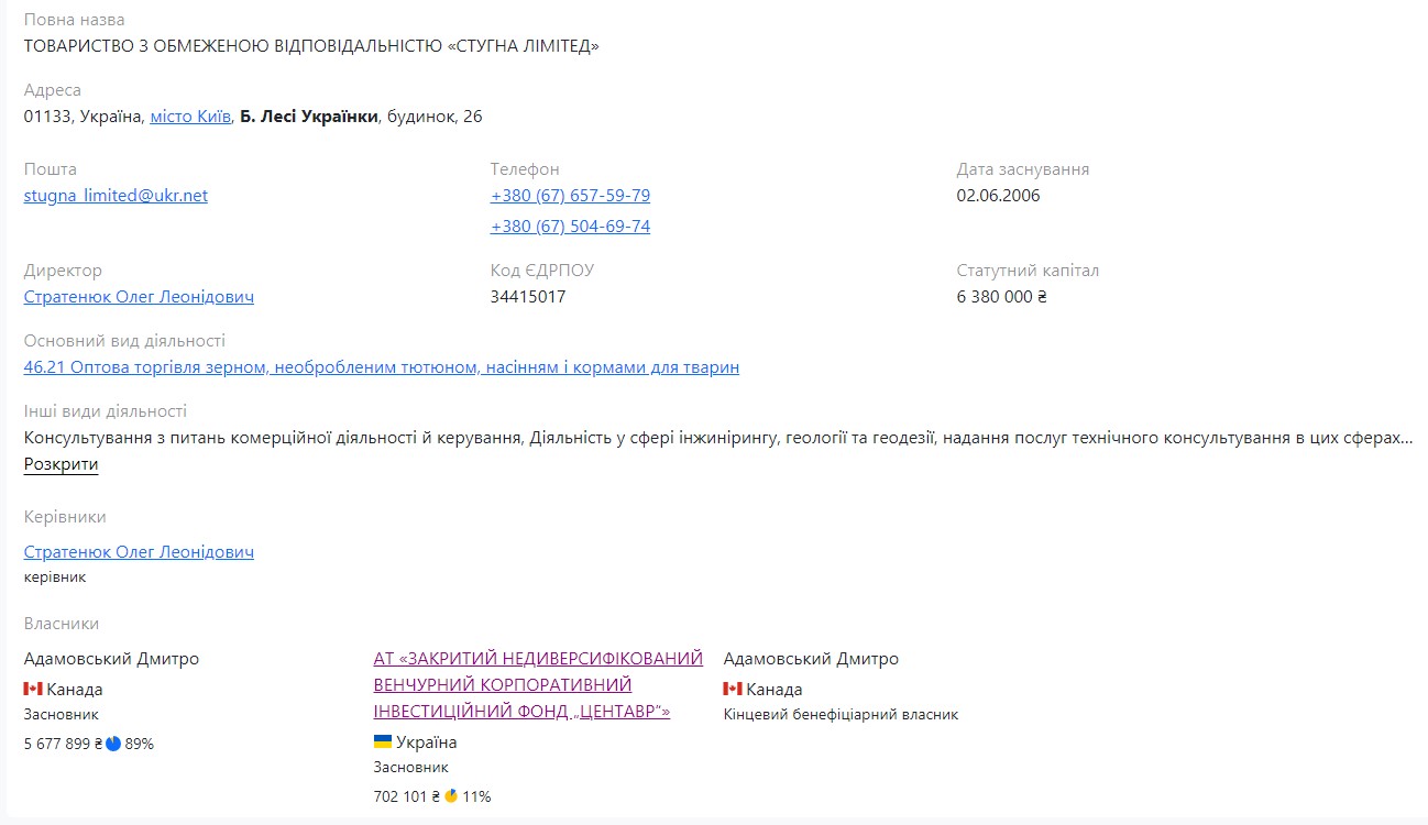 Но это далеко не вся бизнес-империя Дмитрия Андреевича: еще несколькими десятками фирм он владеет опосредовано: либо через других юридических лиц, либо попросту через подставных лиц. Все настолько запутано, что даже поиск в реестрах требует значительных усилий и внимания к деталям. Например, в приведенном выше списке фирм, бенефициаром которых является Дмитрий Адамовский, нет ни ООО «Стугна лимитед», ни ООО «Диамант-агро», ни ООО «Алакор логистик», которые тоже принадлежат Дмитрию Адамовскому. Хотя при другом алгоритме поиска реестр послушно выдает причастность Дмитрия Андреевича к этим фирмам.
