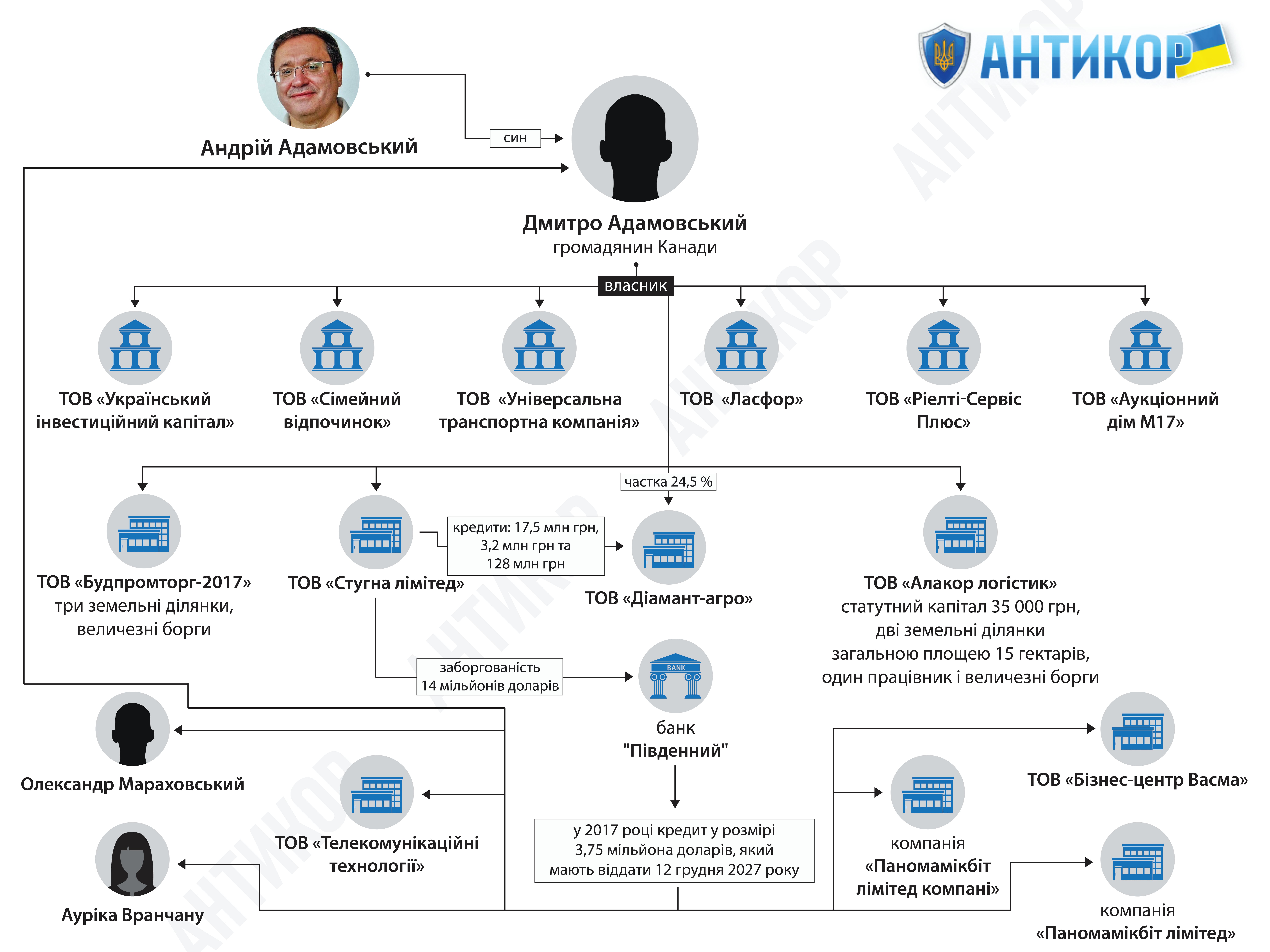 Эти названия интересны нам не просто так. Дело в том, что все эти компании странным образом связаны между собой и с банком «Пивденный»: «Стугна лимитед» имеет задолженность перед банком «Пивденный» в размере 14 миллионов долларов. Срок погашения – 30 ноября 2026 года. Но ООО «Стугна лимитед» немедленно после получения банковского кредита выдало три кредита ООО «Диамант-агро»: 17,5 миллиона гривен, 3,2 миллиона гривен и 128 миллионов гривен. В ООО «Диамант-агро» Дмитрию Адамовскому принадлежит доля в 24,5%, и эта фирма должна отдать «Стугне лимитед» около 3,6 миллиона долларов до 2029 года.